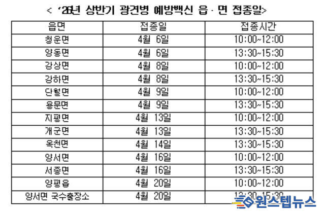 원스텝뉴스 이병희 기자 | 양평군은 오는 4월 6일부터 4월 24일까지 광견병 예방접종을 실시한다고 밝혔다.