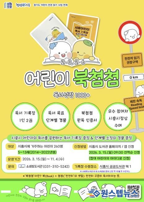 원스텝뉴스 이병희 기자 | 시흥시 소래빛도서관은 오는 3월 15일부터 관내 5~13세 어린이 260명을 대상으로 독서 기록장을 배부하고, 우수 참여자 8명에게 시흥시장상을 수여하는 독서사업 ‘2026 어린이 북쳠쳠 독서성장 1000+’를 운영한다.