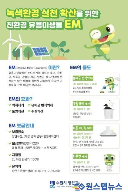 수원시 장안구 관계자는 “2026년에도 시민들의 많은 관심과 참여를 부탁드린다”며 “EM 보급을 통해 시민들이 일상 속에서 친환경 생활을 실천하는 데 도움이 되길 기대한다”고 말했다.
