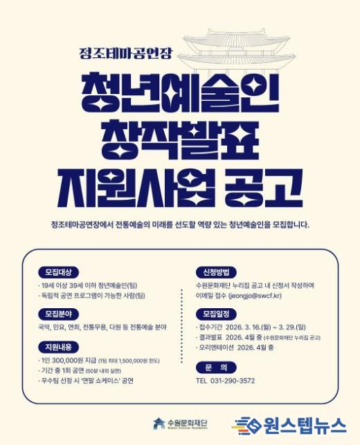 원스텝뉴스 이병희 기자 | 수원문화재단 정조테마공연장은 오는 29일까지 ‘2026 정조테마공연장 청년예술인 창작발표 지원사업’에 참여할 청년예술인을 모집한다. 이번 사업은 전통예술 분야의 역량 있는 청년예술인을 발굴하고, 창작 활동의 기회를 제공하기 위해 마련했다.