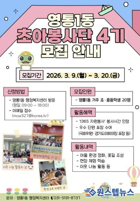 원스텝뉴스 이병희 기자 | 영통구 영통1동은 영통1동 주민자치회가 지역 청소년의 자원봉사 참여 확대를 위해 3월 9일부터 3월 20일까지 관내 초·중학생을 대상으로 ‘초아봉사단 4기’ 단원을 모집한다고 밝혔다.