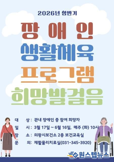 원스텝뉴스 이병희 기자 | 의왕시 보건소가 지역 내 장애인의 건강관리 및 재활 의지 향상을 위해 운영되는 2026년 상반기 장애인 생활체육 프로그램 '희망발걸음'의 참여자를 모집한다.