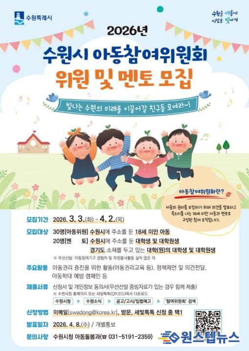 원스텝뉴스 이병희 기자 | 수원특례시는 ‘2026년 아동참여위원회’에서 활동할 아동 위원과 대학(원)생 멘토를 모집한다.