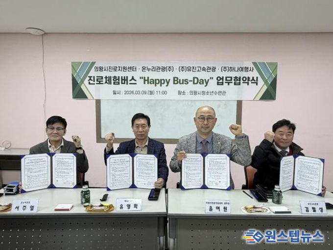 원스텝뉴스 이병희 기자 | 의왕시청소년재단 산하 의왕시진로지원센터 ‘꿈터’가 청소년들의 진로 탐색을 지원하기 위해 3월 9일 관내 운수업체와 ‘진로체험버스’ 운영을 위한 업무협약(MOU)을 체결했다.