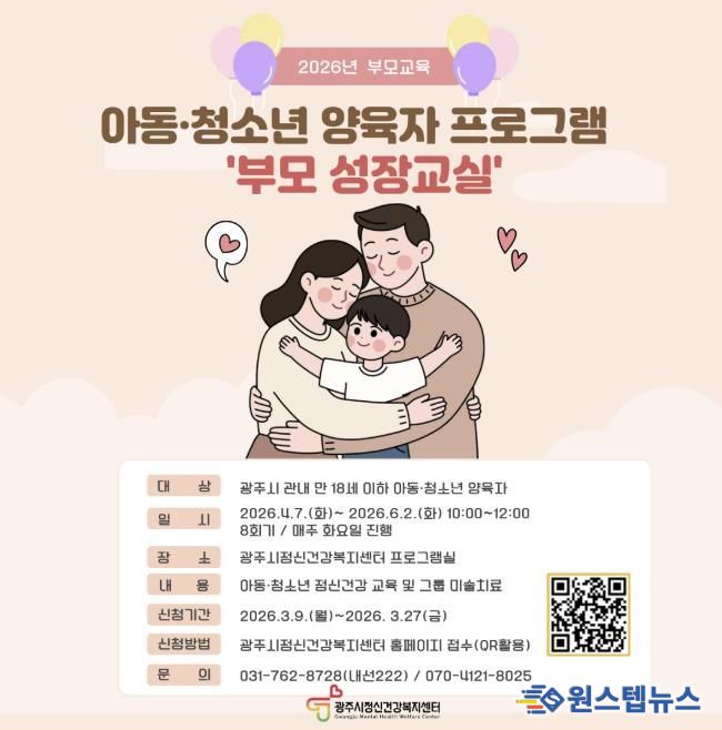 원스텝뉴스 이병희 기자 | 광주시정신건강복지센터는 지역 내 아동·청소년 양육자의 양육 역량을 강화하고 건강한 가정 환경 조성을 지원하기 위해 ‘2026년 제1차 부모 성장 교실’을 운영한다고 10일 밝혔다.