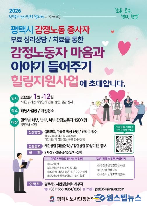 감정노동은 고객 응대 과정에서 자신의 감정을 조절하며 서비스를 제공해야 하는 업무 특성상 지속적인 스트레스와 심리적 부담에 노출되기 쉬운 만큼, 평택시노사민정협의회는 감정노동 종사자들의 심리적 안정을 지원하고자 이번 상담 프로그램을 운영했다.