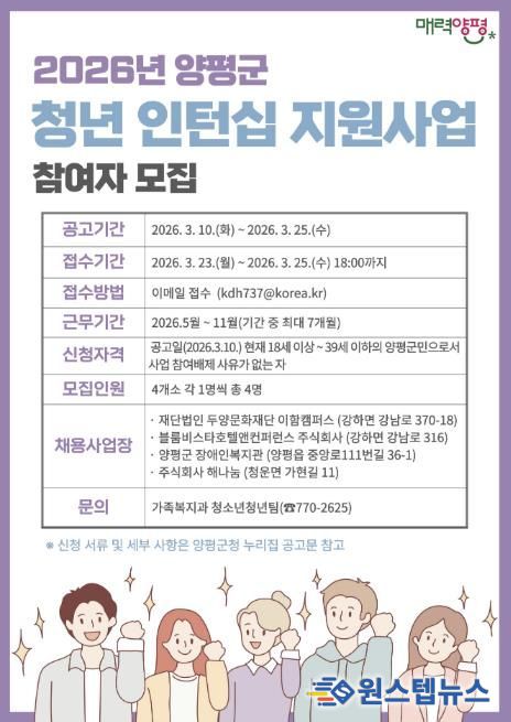 원스텝뉴스 이병희 기자 | 양평군은 인력이 필요한 관내 사업장과 미취업 청년을 연계하고 사업장에 인건비를 지원하는 ‘2026년 양평군 청년 인턴십 지원 사업’ 참여자를 모집한다고 10일 밝혔다.