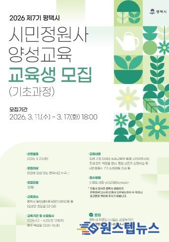 원스텝뉴스 이병희 기자 | 평택시는 ‘제7기 평택시 시민정원사 양성과정(기초)’에 함께할 시민 교육생을 모집한다고 밝혔다.