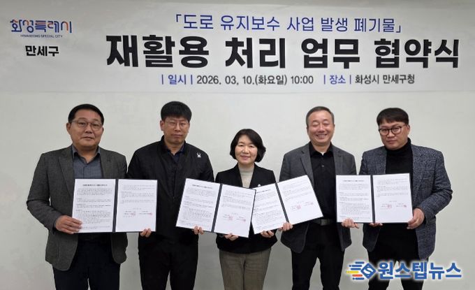 원스텝뉴스 이병희 기자 | 화성특례시 만세구가 도로 유지보수 과정에서 발생하는 폐기물을 효율적으로 처리하고 자원 재활용을 확대하기 위해 관내 아스콘 생산 업체와 ‘폐아스콘 재활용 처리 협약’을 체결했다.