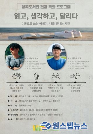 원스텝뉴스 천규영 기자 | 김포시 양곡도서관은 오는 3월 24일부터 4월 14일까지 시민들의 건강한 여가 생활과 독서 문화 확산을 위한 특화 프로그램 '읽고, 생각하고, 달리다'를 운영한다.