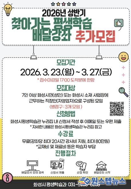 원스텝뉴스 이병희 기자 | 화성특례시는 시민의 다양한 학습 수요를 반영한 맞춤형 평생학습 프로그램 운영을 위해 ‘2026년 상반기 찾아가는 평생학습 배달강좌’를 추가 모집한다고 밝혔다.