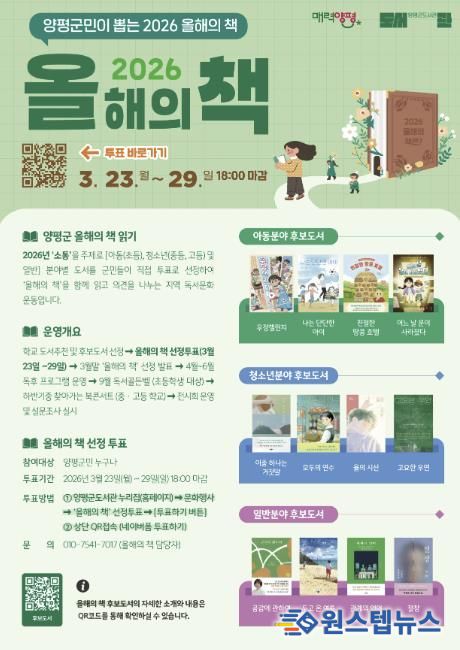 원스텝뉴스 이병희 기자 | 양평군은 지역 주민과 함께 한 권의 책을 읽고 공감하는 독서문화 확산을 위해 2026년 ‘올해의 책’ 후보 도서를 선정하고 군민 투표를 실시한다고 밝혔다.
