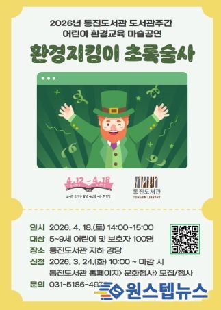 ‘환경지킴이 초록술사’ 공연은 4월 18일 오후 2시부터 3시까지 통진도서관 지하 강당에서 진행된다. 대상은 5~9세 어린이 및 보호자 100명이다. 참여를 원할 경우 3월 24일 오전 10시부터 통진도서관 누리집에서 신청하면 된다.