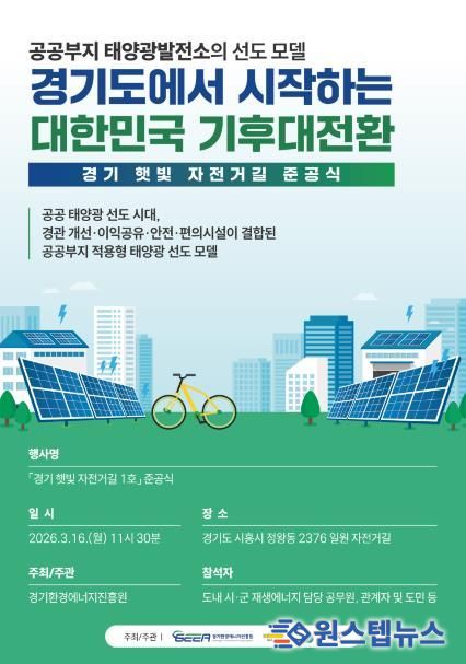 원스텝뉴스 이병희 기자 | 경기환경에너지진흥원은 16일 시흥시 정왕동 2376일원 자전거길에서 ‘경기 햇빛 자전거길 1호’ 준공식을 개최한다고 13일 밝혔다.