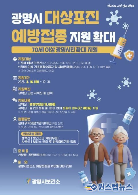 원스텝뉴스 이병희 기자 | 광명시가 오는 16일부터 70세 이상 시민을 대상으로 대상포진 예방접종 지원사업을 확대 시행한다.