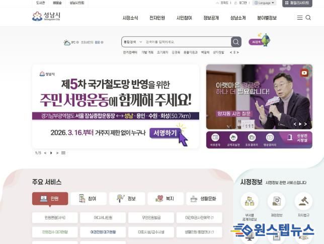원스텝뉴스 이병희 기자 | 성남시는 3월 16일부터 경기남부광역철도의 ‘제5차 국가철도망 구축계획’ 반영을 촉구하기 위한 온·오프라인 범시민 서명운동을 추진한다고 밝혔다.