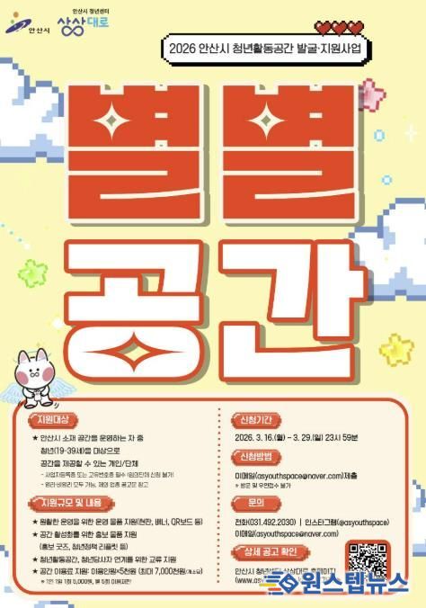 모집 대상은 안산시에 소재하고 사업자등록증을 보유한 공간 운영자다. 취업스터디 공간, 공방, 책방, 강의실, 문화예술 공간 등 청년 모임이 가능한 개인 또는 단체라면 누구나 신청할 수 있다.