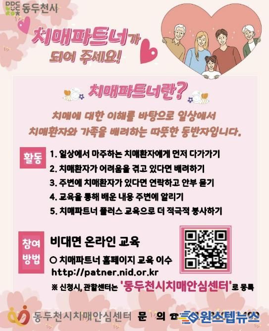 원스텝뉴스 이병희 기자 | 동두천시보건소 치매안심센터는 치매에 대한 부정적 인식을 개선하고 돌봄 문화 확산으로 치매 친화적 환경을 조성하기 위해 ‘치매파트너’ 양성 대상자를 상시 모집한다고 밝혔다