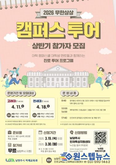 원스텝뉴스 천규영 기자 | 남양주시는 오는 4월 11일과 18일 양일간 관내 초등학교 4학년부터 고등학생을 대상으로 ‘무한상상 캠퍼스 투어’ 프로그램을 운영한다고 16일 밝혔다.