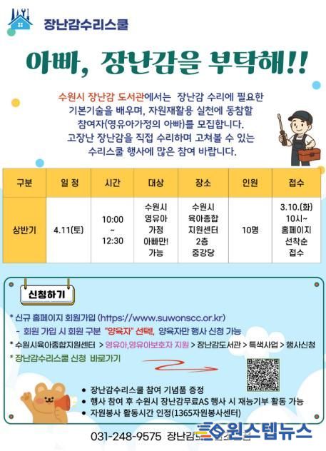 수원시육아종합지원센터 관계자는 “고장 난 장난감을 수리해 폐장난감을 줄이고 환경보호를 실천하는 교육”이라며 “아버지가 아이와 함께 소통하며 육아에 적극적으로 참여하는 문화가 확산되는 계기가 되길 바란다”고 말했다.