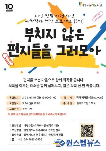 원스텝뉴스 천규영 기자 | 광명시 소하도서관은 시민들의 인문학적 소양을 함양하고 창작 활동을 지원하기 위해 ‘새싹작가 성장 프로젝트 3기’ 수강생을 지난 16일부터 모집하고 있다.