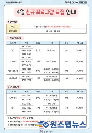 원스텝뉴스 이병희 기자 | 광명도시공사는 광명건강체육센터에서 시민들의 건강 증진과 생활체육 활성화를 위해 체육관 및 GX실 4월 신규 프로그램 회원을 모집한다고 밝혔다.
