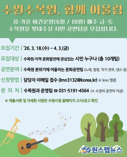 원스텝뉴스 이병희 기자 | 수원특례시가 수원수목원에서 열리는 시민 참여 문화공연 ‘수원수목원, 함께 어울림’에 참여할 시민 공연팀을 4월 3일까지 모집한다.