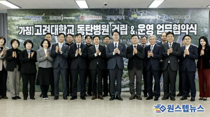 시는 18일 동탄구청 대회의실에서 한국토지주택공사(LH), 고려대학교 의료원, 컨소시엄 대표사(리즈인터내셔날, 우미건설, 미래에셋증권)와 함께 ‘(가칭)고려대학교 동탄병원 건립 지원 및 성공적 사업 추진을 위한 업무 협약’을 체결했다.