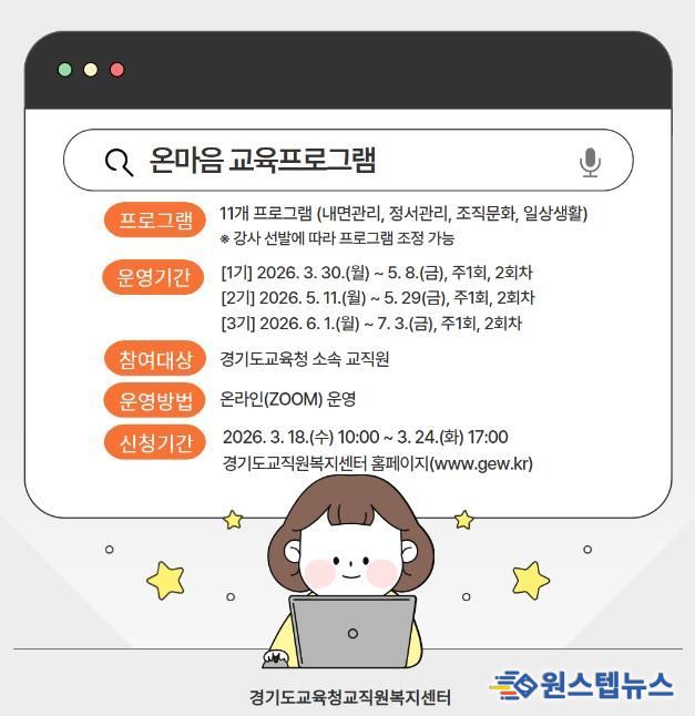 원스텝뉴스 이병희 기자 | 경기도교육청교직원복지센터가 교직원의 정서 회복과 자기 돌봄 역량 강화를 위해 녪년 상반기 온마음 교육 프로그램’를 운영한다.