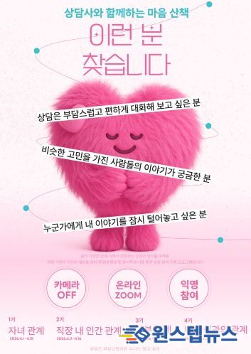 4월 1일부터 5월 21일까지 운영되는 이번 프로그램은 교직원이 일상에서 겪는 다양한 관계 속에서 느끼는 감정을 편안하게 이야기하며 자신의 마음을 돌아볼 수 있도록 마련했다.