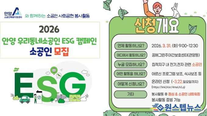 원스텝뉴스 이병희 기자 | 안양산업진흥원은 오는 22일까지 소공인지원센터의 소공인 사회공헌 프로그램인 ‘2026 안양 우리동네소공인 ESG 캠페인’에 참여할 관내 소공인을 모집한다고 18일 밝혔다.