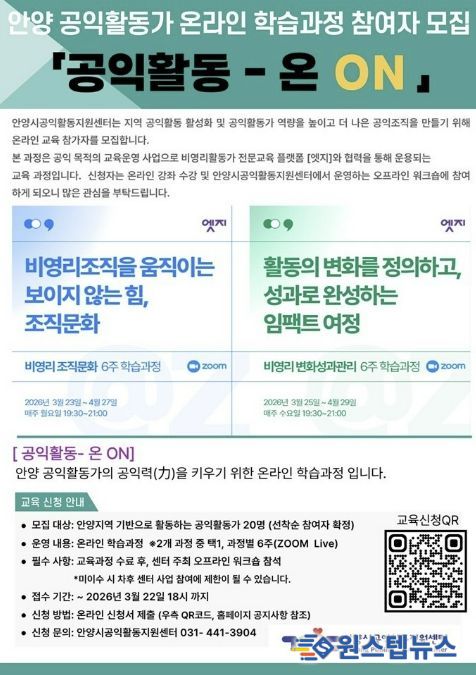 원스텝뉴스 이병희 기자 | 안양시공익활동지원센터가 지역 공익활동가들의 철학적 토대를 다지는 교육을 성공적으로 마친 데 이어, 실천적 전문성을 높이기 위한 온라인 교육 과정을 본격 가동하며 활동가 지원에 박차를 가하고 있다.