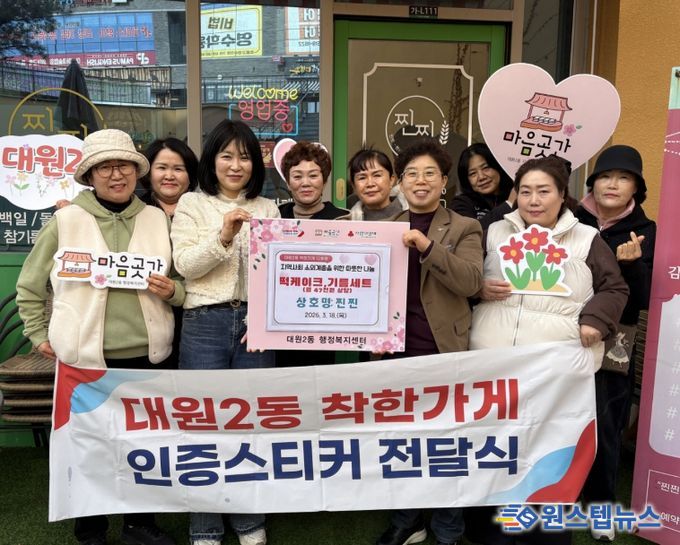 원스텝뉴스 이병희 기자 | 오산시 대원2동 행정복지센터는 지역사회 나눔 문화 확산을 위해 ‘찐찐’을 대원2동 착한가게 12호점으로 지정하고, 지난 18일 착한가게 인증스티커 전달식을 진행했다고 밝혔다.