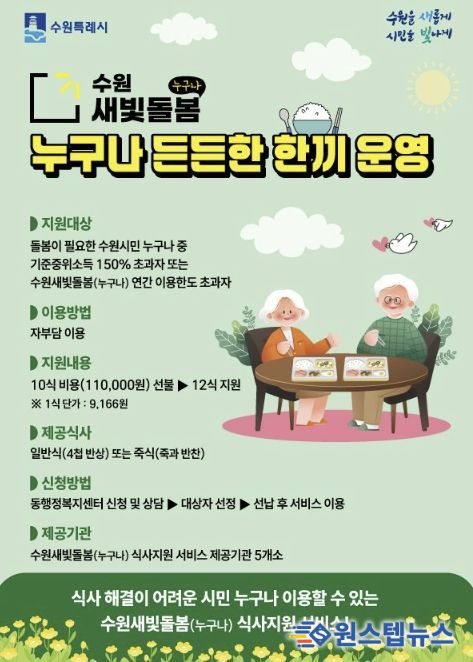 식사 지원이 필요하지만 수원새빛돌봄(누구나) 기준(기준중위소득 150%)을 초과해 자부담으로 서비스를 이용하는 시민과 식사 지원 서비스 연간 이용 한도를 모두 사용한 시민의 부담을 줄이고, 이용을 지원하기 위해 마련한 사업이다.