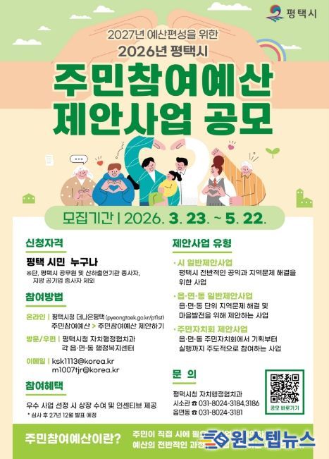 원스텝뉴스 이병희 기자 | 평택시가 3월 23일부터 5월 22일까지 2027년도 예산 편성을 위한 2026년도 주민참여예산 제안사업 공모를 시행한다.