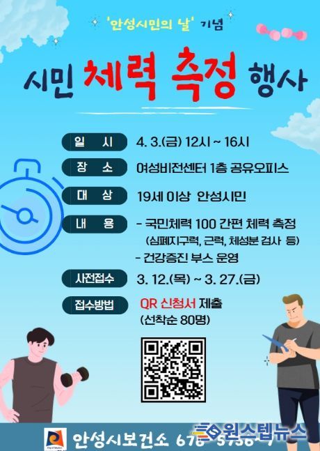 이번 행사는 오는 4월 3일 오후 12시부터 4시까지 안성시 여성비전센터 1층 공유오피스에서 진행된다. 현장에서는 체력 측정뿐만 아니라 심뇌혈관 질환 예방, 신체활동, 금연, 구강 관리 등 건강 인식 향상을 위한 다양한 건강증진 부스도 함께 운영될 예정이다.