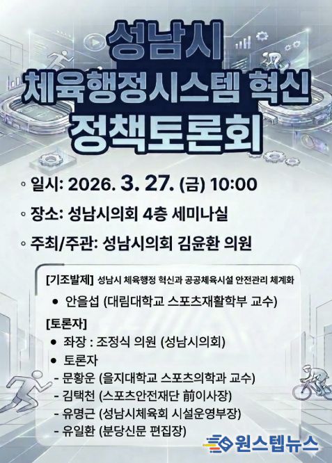 원스텝뉴스 이병희 기자 | 성남시의회 김윤환 의원(문화복지체육위원회)은 오는 27일, 성남시 체육행정의 혁신 방향을 모색하기 위한 '성남시 체육행정시스템 혁신 정책토론회'를 개최한다고 밝혔다.