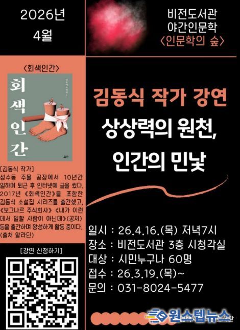 원스텝뉴스 이병희 기자 | 평택시 비전도서관은 오는 4월 16일 저녁 7시 김동식 작가를 초청하여 ‘상상력의 원천, 인간의 민낯’을 주제로 야간 인문학 강연을 진행한다.