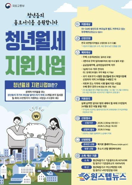 지원 대상은 만 19세부터 34세 이하의 청년으로, 부모와 별도로 거주하는 무주택자여야 하며 전입신고가 필수다. 지원 내용은 생애 1회 한해 실제 납부한 임대료 범위 내에서 월 최대 20만 원씩, 최대 24개월 동안 분할 지급된다.
