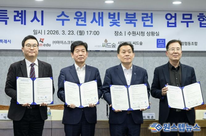 수원시와 ㈜아이스크림에듀, (사)씨드(Seed)숲, 수원시서점협동조합은 23일 시청 상황실에서 ‘수원새빛북런(Book Learn) 업무협약’을 체결하고, 협력을 약속했다.
