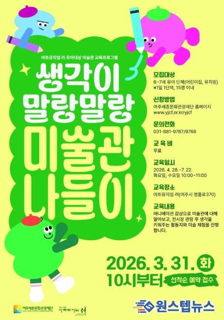 원스텝뉴스 천규영 기자 | 여주세종문화관광재단은 유아를 대상으로 하는 미술관 교육프로그램 '생각이 말랑말랑, 미술관 나들이'를 오는 4월부터 10월까지 아트뮤지엄 려에서 운영한다고 밝혔다.