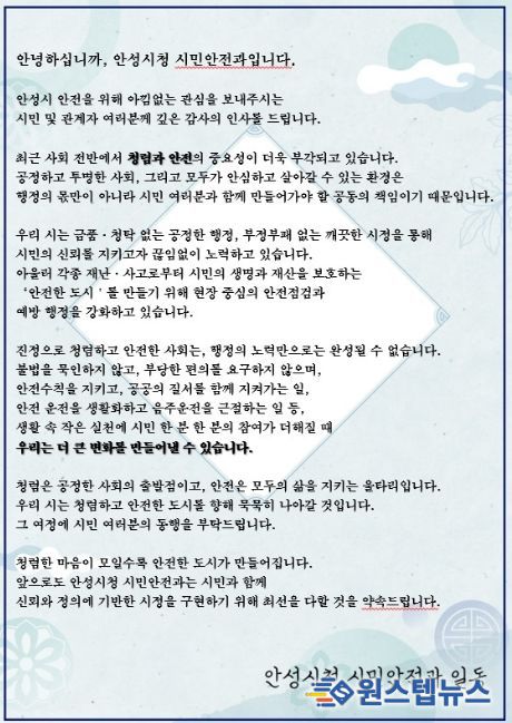 원스텝뉴스 이병희 기자 | 안성시는 각종 안전점검 과정에서 청렴 안내문을 배부하는 ‘청렴한 안전점검’을 추진하며 시민 청렴의식 제고에 나선다.