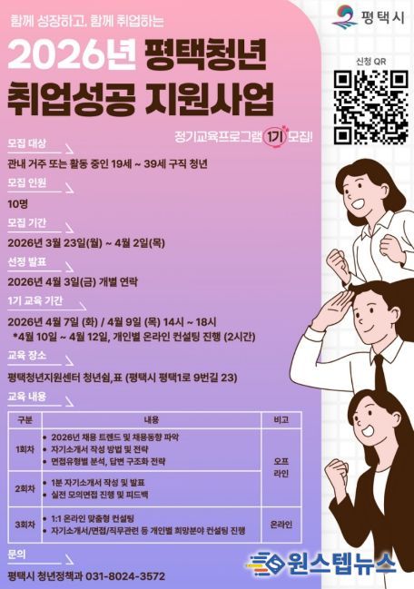 원스텝뉴스 이병희 기자 | 평택시는 관내 청년들의 취업역량 강화를 위해 ‘평택청년 취업 성공 지원사업’정기교육 1기 참여자를 오는 4월 2일까지 모집한다.