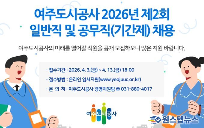 원스텝뉴스 이병희 기자 | 여주도시공사는 공공서비스 품질 향상과 조직 경쟁력 강화를 위해 2026년 제2회 일반직 및 공무직, 기간제 채용을 실시한다고 밝혔다.