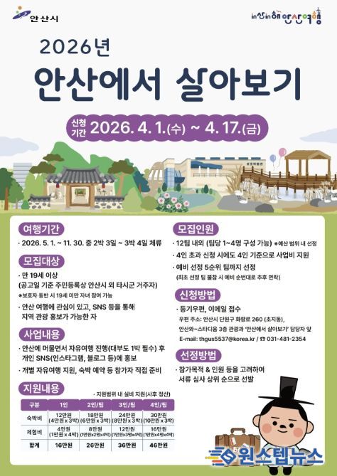 시는 총 12개 이내로 참여 팀을 선발할 예정이며, 최종 선정 결과는 4월 30일 발표된다. 선정된 참여팀은 5월부터 11월까지 기간 중 2박3일 또는 3박4일 일정으로 안산을 자유롭게 여행하고, SNS에 홍보 콘텐츠를 게시하면 숙박비와 체험비를 지원받는다.