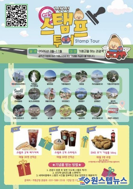 가평군은 이달 20일부터 11월 30일까지 관외 관광객을 대상으로 ‘2026년 가평 구석구석 스탬프투어’를 운영한다고 밝혔다.