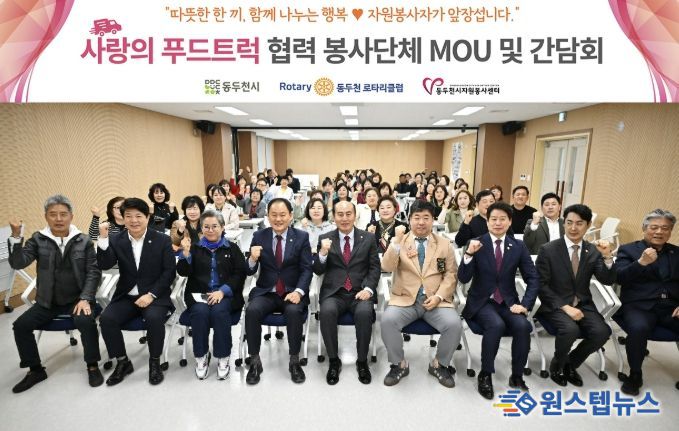 원스텝뉴스 이병희 기자 | 동두천시자원봉사센터는 지난 24일 생연공유누리센터 강당에서 12개 자원봉사단체와 동두천 로타리클럽이 참여한 가운데 ‘사랑의 푸드트럭’ 운영 활성화를 위한 업무협약(MOU)과 간담회를 개최했다.
