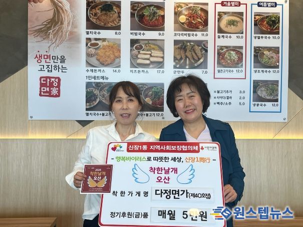 한편 신장1동은 착한가게 발굴을 지속적으로 확대하며 지역 내 나눔문화 확산과 촘촘한 돌봄체계 구축을 위한 다양한 복지사업을 이어갈 계획이다.