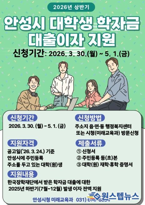 원스텝뉴스 이병희 기자 | 안성시는 대학생 및 대학원생들의 교육비 부담을 덜어주기 위해 ‘2026년 상반기 대학생 학자금 대출이자 지원사업’을 시행한다고 밝혔다.