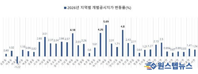 지역별 상승률은 메디컬클러스터 등 개발 수요의 영향으로 운정지역 서패동 5.69%, 와동동 4.8%, 하지석동 4.26%, 동패동 4.18%로 다소 높게 나타났다. 개별토지 기준 최고 지가는 금촌동 54-27번지 상업용지가 제곱미터(㎡)당 5,765,000원, 와동동 1472-1번지 중심상업용지가 제곱미터(㎡)당 5,243,000원으로 확인됐다.